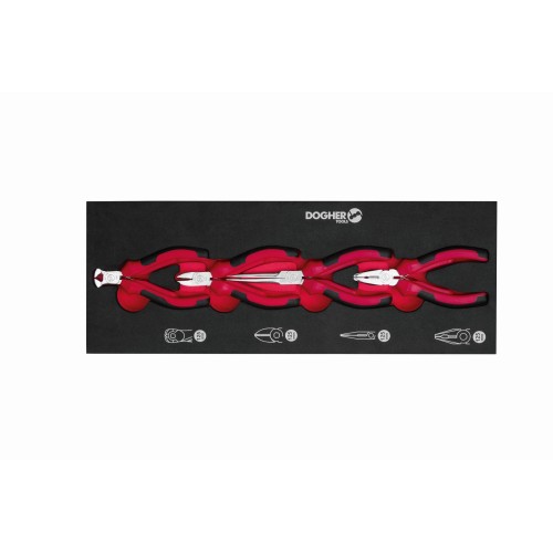 Incluye cuatro tipos de alicates (universal, corte frontal, corte diagonal y boca semiredonda), fabricados en acero Cromo Vanadio de alta calidad para una larga vida útil.