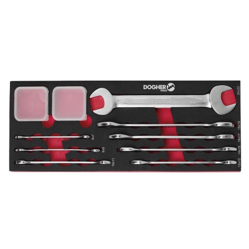 Bandeja combinable 1/4 con 8 llaves de doble boca abierta diseñada específicamente para carros de taller.