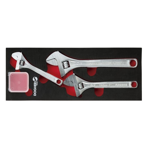 Bandeja 3 llave ajustable con moleta central y boca inclinada 15º es una herramienta versátil y resistente, ideal para trabajos mecánicos y de mantenimiento.