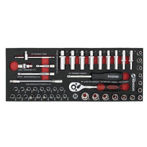 Bandeja combinable de formato 1/4 equipada con 46 vasos hexagonales de 1/4", ideal para mantener el orden y facilitar el acceso rápido a herramientas en el entorno del taller.