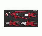 La bandeja combinable 1/3 con 3 alicates y una tenacilla es el módulo ideal para organizar herramientas en carros de taller.