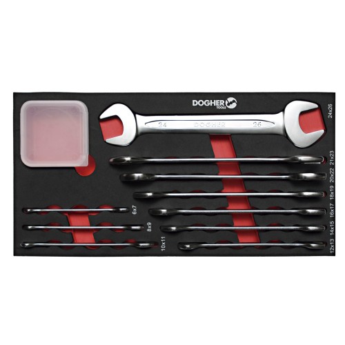 Bandeja combinable 1/3 con 10 llaves de doble boca abierta, ideal para su uso en carros de taller profesionales.