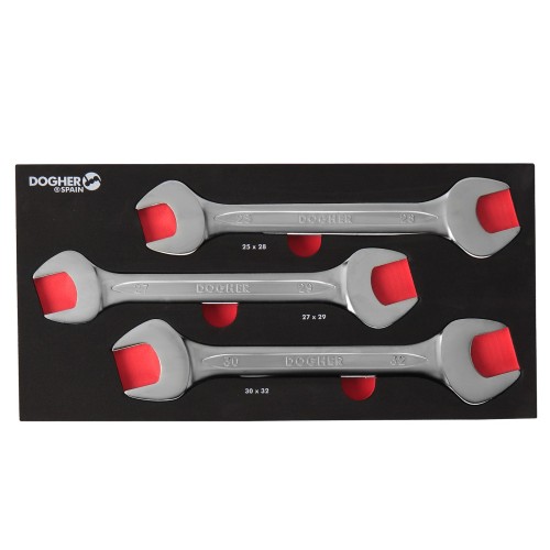 La bandeja combinable 1/3 con 3 llaves de doble boca abierta es una solución práctica y eficiente para equipar cajones de carros de taller con herramientas esenciales.