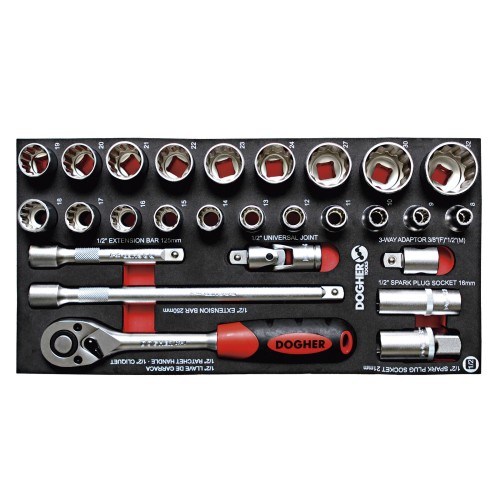 Bandeja combinable 1/3 con 27 vasos bihexagonales de 1/2”, diseñada para una perfecta organización en carros de taller profesionales.