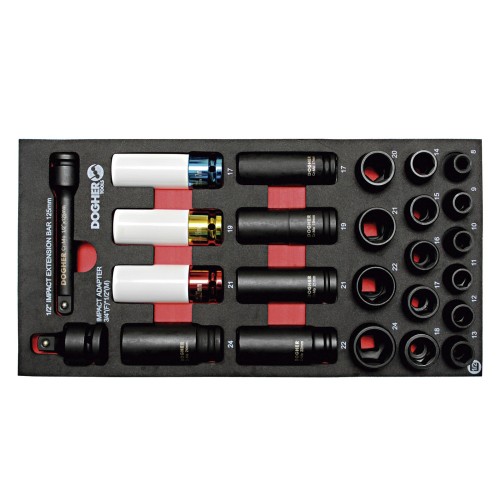 - Incluye 25 vasos de impacto de 1/2" fabricados en acero de alta resistencia.
