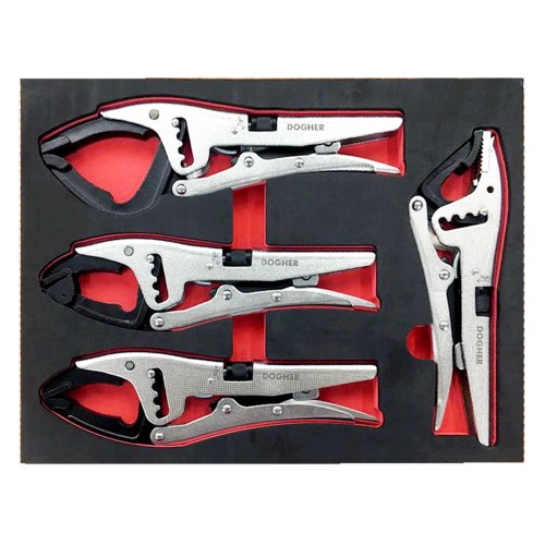 - Incluye 4 tenazas Grip: Boca recta de 220 mm, curva de 250 mm, oscilante de 250 mm y cisne de 270 mm.