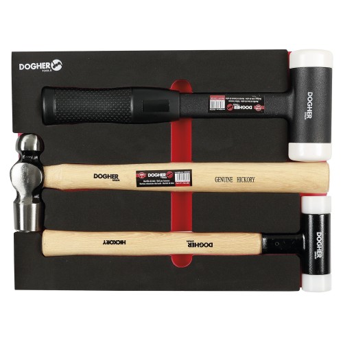 - Incluye 3 martillos: dos de nylon y uno de bola, cubriendo diversas aplicaciones mecánicas.