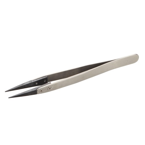La pinza de acero inoxidable con puntas extrafinas de fibra de carbono ESD de 130 mm es una herramienta de precisión ideal para trabajos delicados en electrónica, laboratorio y ensamblaje de componentes sensibles.