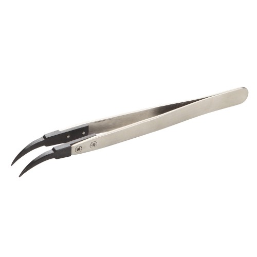 La pinza de acero inoxidable con puntas curvas de fibra de carbono ESD (130 mm) está diseñada para trabajos de precisión en entornos donde la sensibilidad electrostática es crítica.