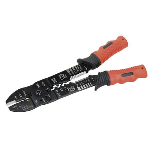 Este alicate multifunción para terminales aislados y no aislados de 250 mm de largo está diseñado para trabajos eléctricos profesionales, combinando tres funciones en una sola herramienta: cortar, pelar y prensar cables.