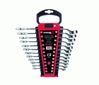 Juego de 12 llaves combinadas acodadas con medidas métricas de 8 a 19 mm, presentadas en un práctico soporte plástico para su almacenamiento y transporte.