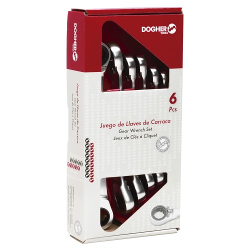 Juego de 6 llaves carraca acodadas 15º fabricadas en resistente acero Cromo Vanadio (CrV), ideales para trabajos mecánicos que requieren precisión y acceso en espacios reducidos.