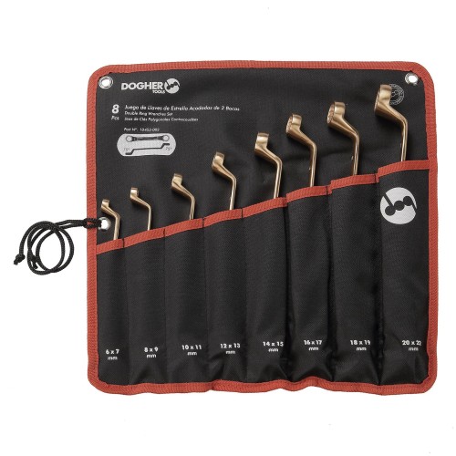 Bolsa compuesta por 8 llaves estrella acodadas a 75°, fabricadas en aleación de cobre-berilio o aluminio-bronce, ideales para entornos con riesgo de explosión.