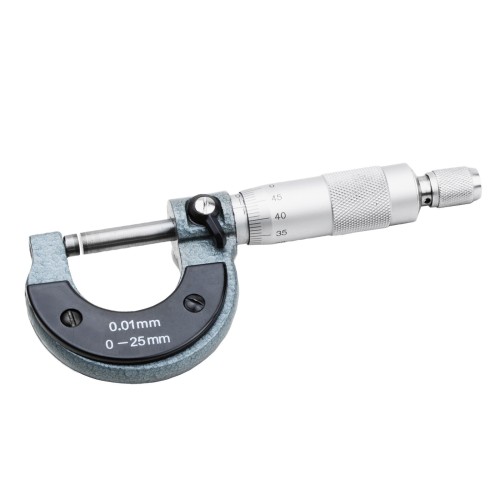 Micrómetro centesimal de precisión diseñado para mediciones externas en rangos de 0 a 25 mm, con una resolución de 0,01 mm.