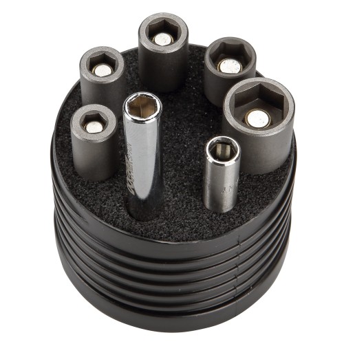 Este kit de 5 vasos para atornillar con conexión hexagonal de 1/4" y 50 mm de largo incluye medidas 6, 7, 8, 10 y 13 mm, además de 2 portapuntas de 50 y 74 mm.