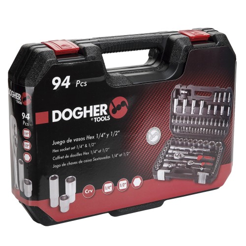 Juego de vasos hexagonales 1/4" y 1/2" de 94 piezas diseñado para ofrecer un rendimiento profesional en tareas de mantenimiento y montaje.