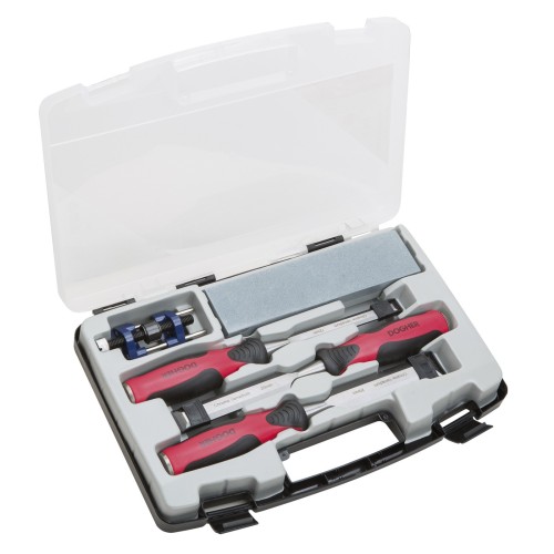 Juego profesional compuesto por 3 formones fabricados en acero Cromo Vanadio, ideal para trabajos precisos de carpintería y ebanistería.