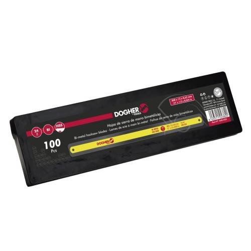 Pack de 100 hojas de sierra fabricadas en bimetal HSS, ideales para cortes exigentes en metal y otros materiales duros.