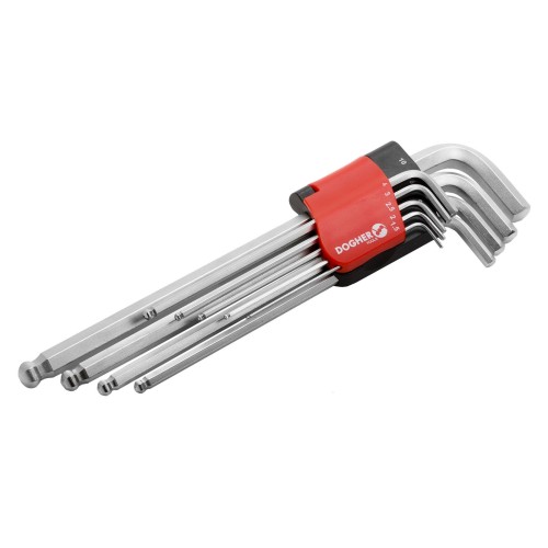 Juego de 9 llaves macho hexagonales DOGHER Tools con diseño de extremo redondeado y cuerpo extra largo para acceder a tornillos en ubicaciones profundas o de difícil acceso.