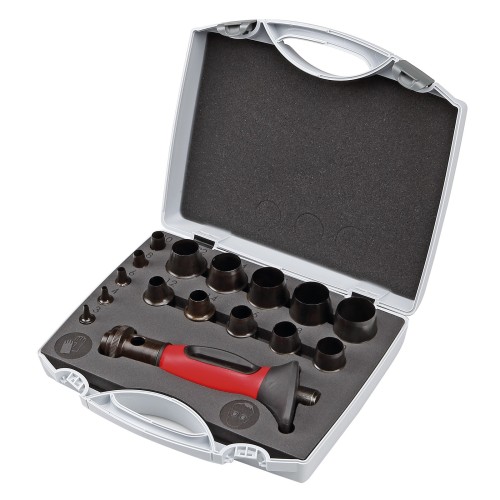 Juego profesional de 16 piezas sacabocados con mango bimaterial, ideal para trabajos de precisión en cuero, goma, cartón y materiales similares.